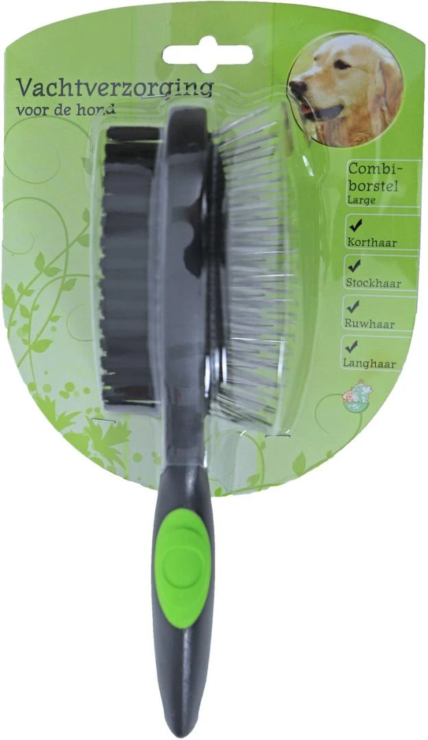 De borstel combi 2 zijdig large verzorgt de vacht van jouw hond door middel van het verwijderen van losse en dode haren. De nylon zijde van deze combi-borstel is geschikt voor alle soorten honden, ongeacht de vachtsoort, de stalen zijde kun je het beste gebruiken voor honden met een stokhaar- of langharige vacht.