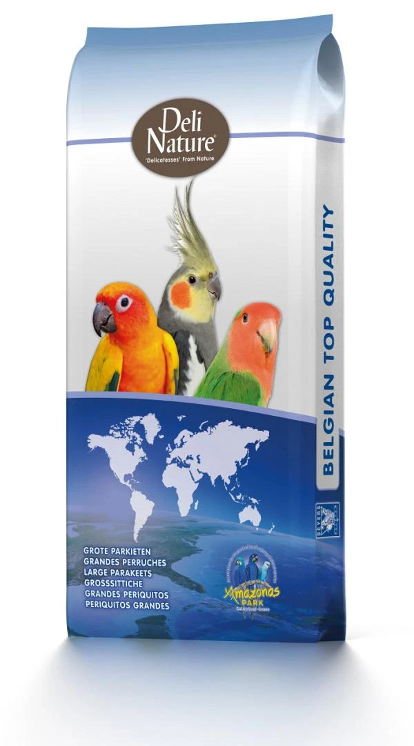 Deli Nature Grote Parkiet zonder zonnepitten is een mengeling voor grote parkieten ZONDER zonnebloempitten. Ideaal om vervetting te voorkomen bij jouw grote parkieten en voor de kleinere soorten zoals de roodrug en blue bonnet. Perfect om te voederen tijdens de kweek. Zeer geschikt voor rosé kaketoes die de neiging hebben om sneller vet te worden.
