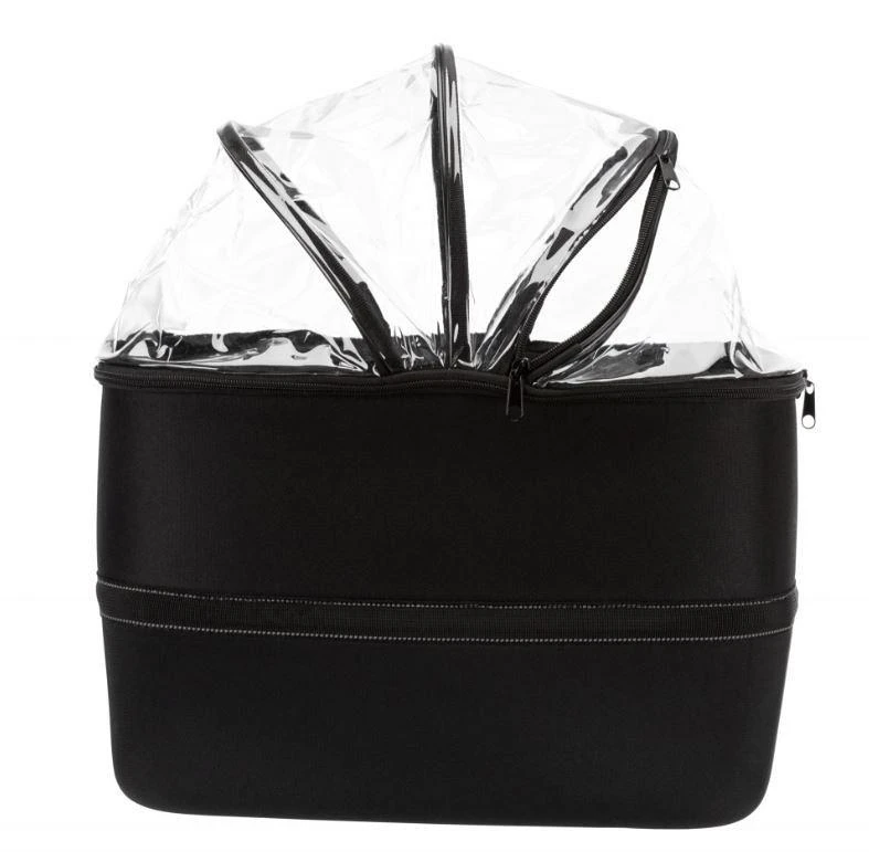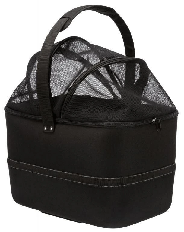 Ook heeft de mand een regenkap voor reizen bij slechte weersomstandigheden. En heb je de afdekking toch liever open? Dan kun je jouw hond vastmaken aan de geïntegreerde korthouder, zodat de hond lekker om zich heen kan kijken zonder dat hij uit de mand springt. Deze mand is ook als vervoerstas te gebruiken: door het gemakkelijke click & go systeem kun je hem zo van de beugel afhalen en meenemen als stevige draagtas.