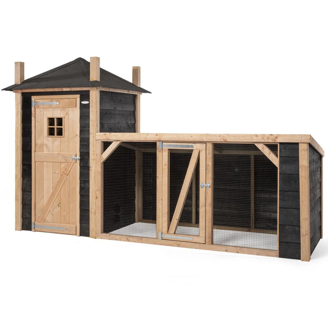 Het nachthok is ontworpen met de klassieke details van een hooiberg, wat een stijlvolle uitstraling geeft aan dit verblijf. Het stevige frame van het hok is gemaakt van geïmpregneerde houten balken welke een robuuste basis geeft aan het geheel. De buitenzijde is verstevigd met Douglas balken welke tevens de dakconstructie ondersteunen. Doordat het verblijf is afgewerkt met zwarte potdekseldelen ontstaat een stijlvol totaalplaatje welke zeker niet zou misstaan in de achtertuin. Via de grote toegangsdeur kun je het hok eenvoudig zelf betreden. De grote toegangsdeur is voorzien van een schuifslot, robuuste scharnieren én een plexiglas venster voor meer daglicht.